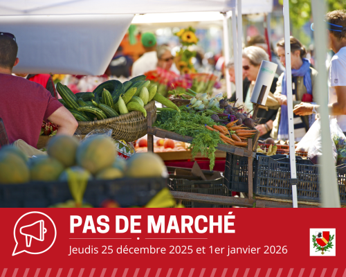 Nous vous informons que le marché hebdomadaire du jeudi sera exceptionnellement annulé les jeudis 25 décembre 2025 et 1er janvier 2026, en raison des fêtes de fin d’année.