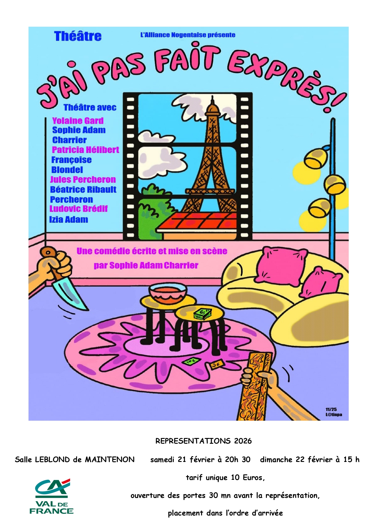 Le Club Louis ROY organise une représentation théâtrale en partenariat avec l’Alliance Nogentaise, qui présentera la comédie « J’ai pas fait exprès ».